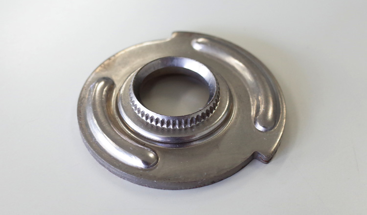 大径の溝成形品です。新工法により、従来「切削加工+プレス加工」で行っていた形状を、